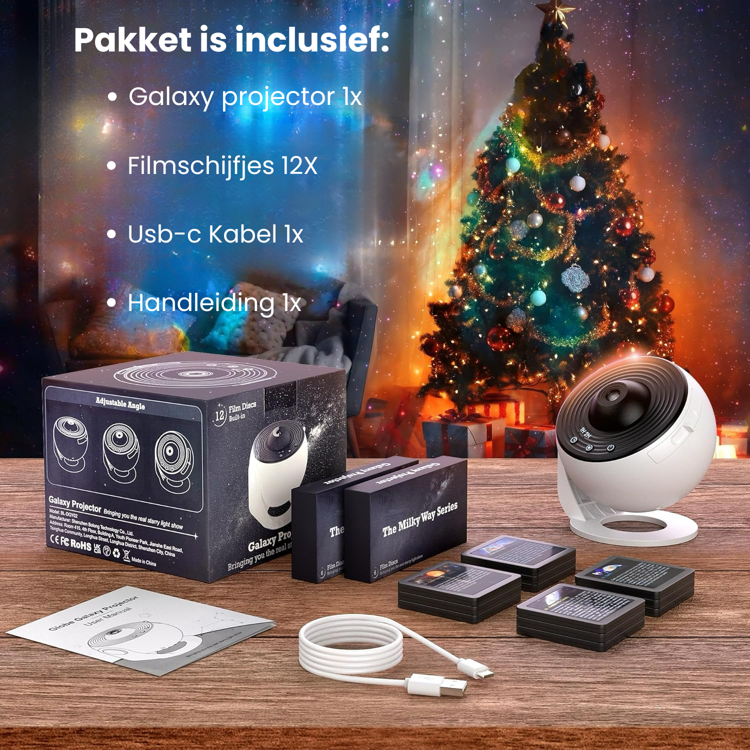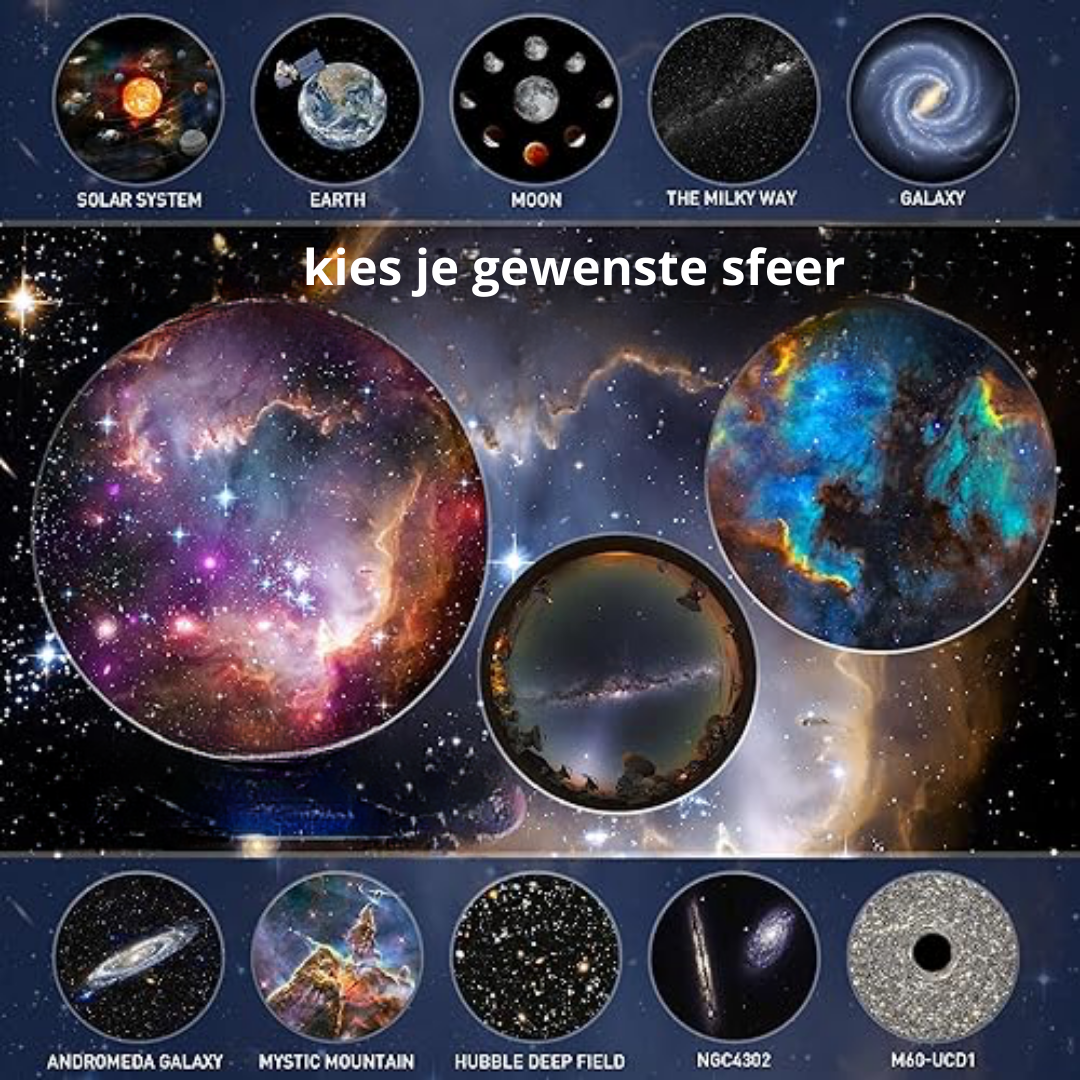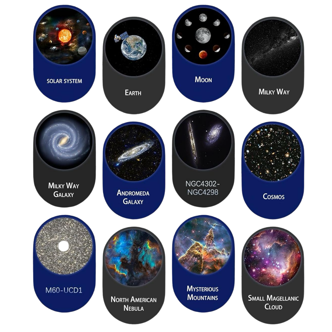 Dankzij de 12 verwisselbare projectieschijven geniet je van verschillende indrukwekkende universum-scènes: sterrenstelsels, planeten, nevels en diepe ruimte-effecten in haarscherpe kwaliteit.